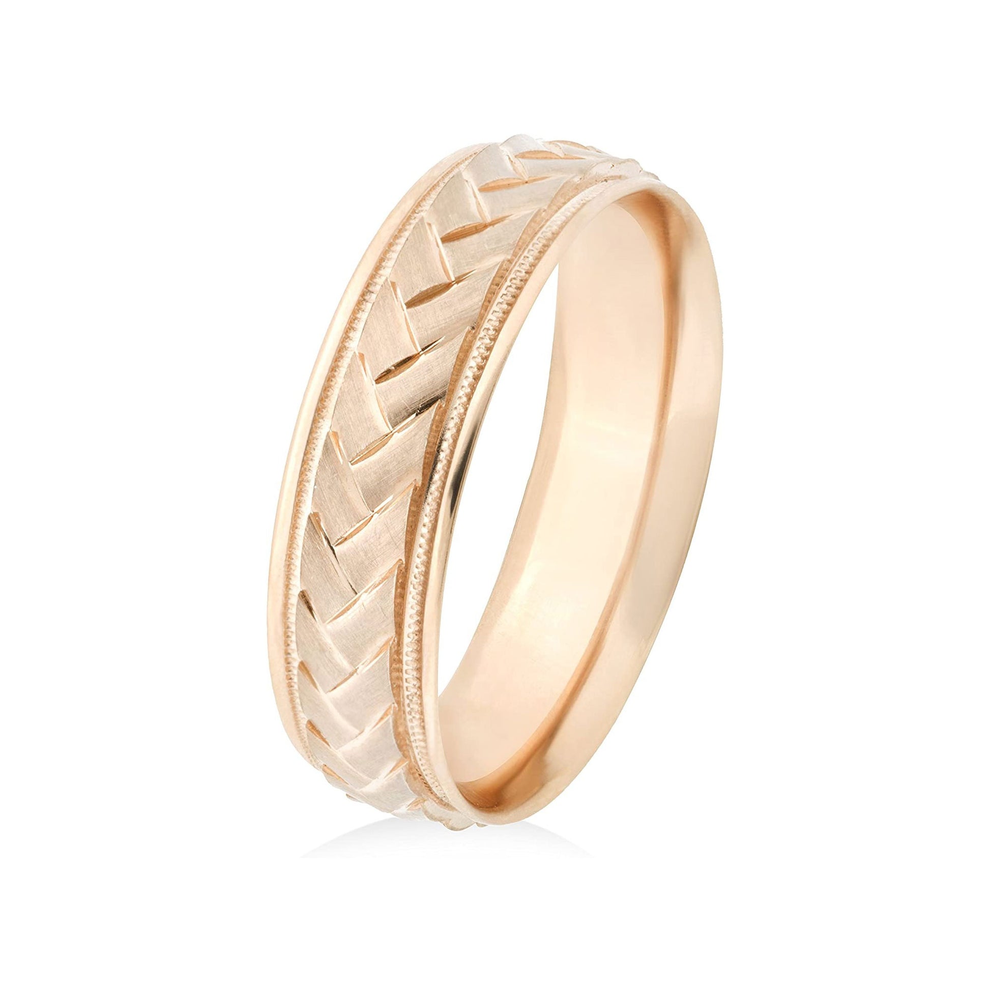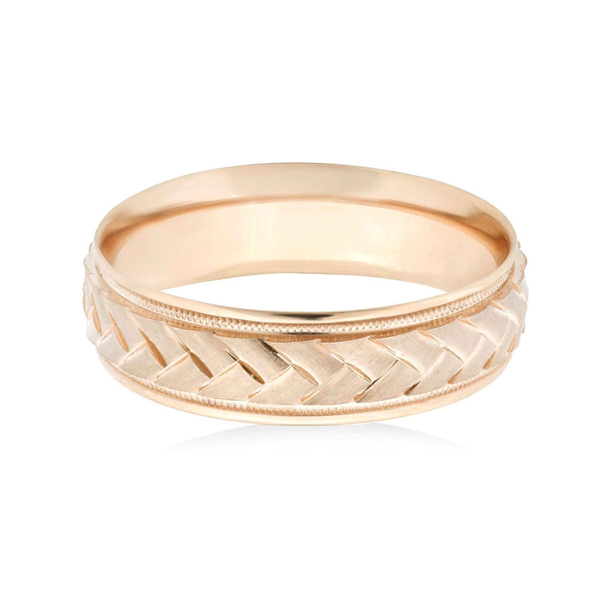 This incredible 14K Rose Gold 7mm Braided Wedding Band coupled with the strength and comfort of the comfort-fit design combine to make this band a great choice as a stand-alone wedding band or as a great addition to any engagement ring. The band, with it's smooth design and polished finish is a wonderful choice for the traditional bride and groom of today.