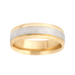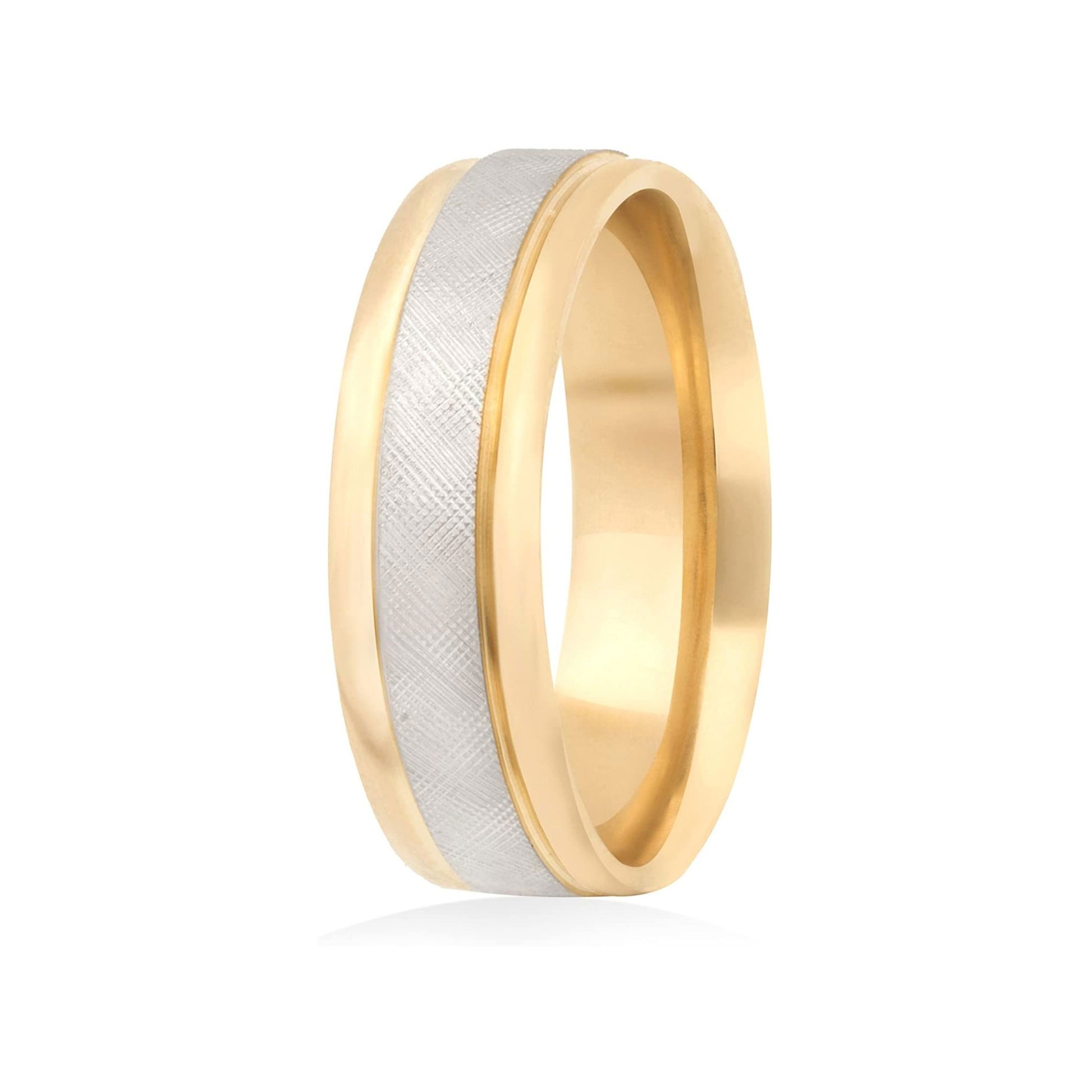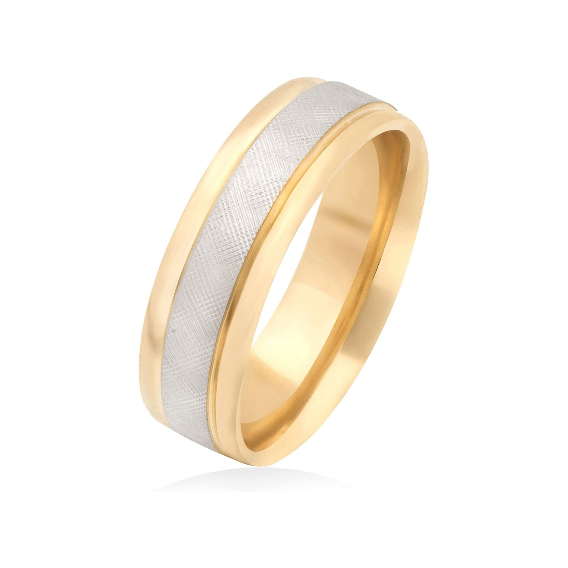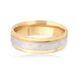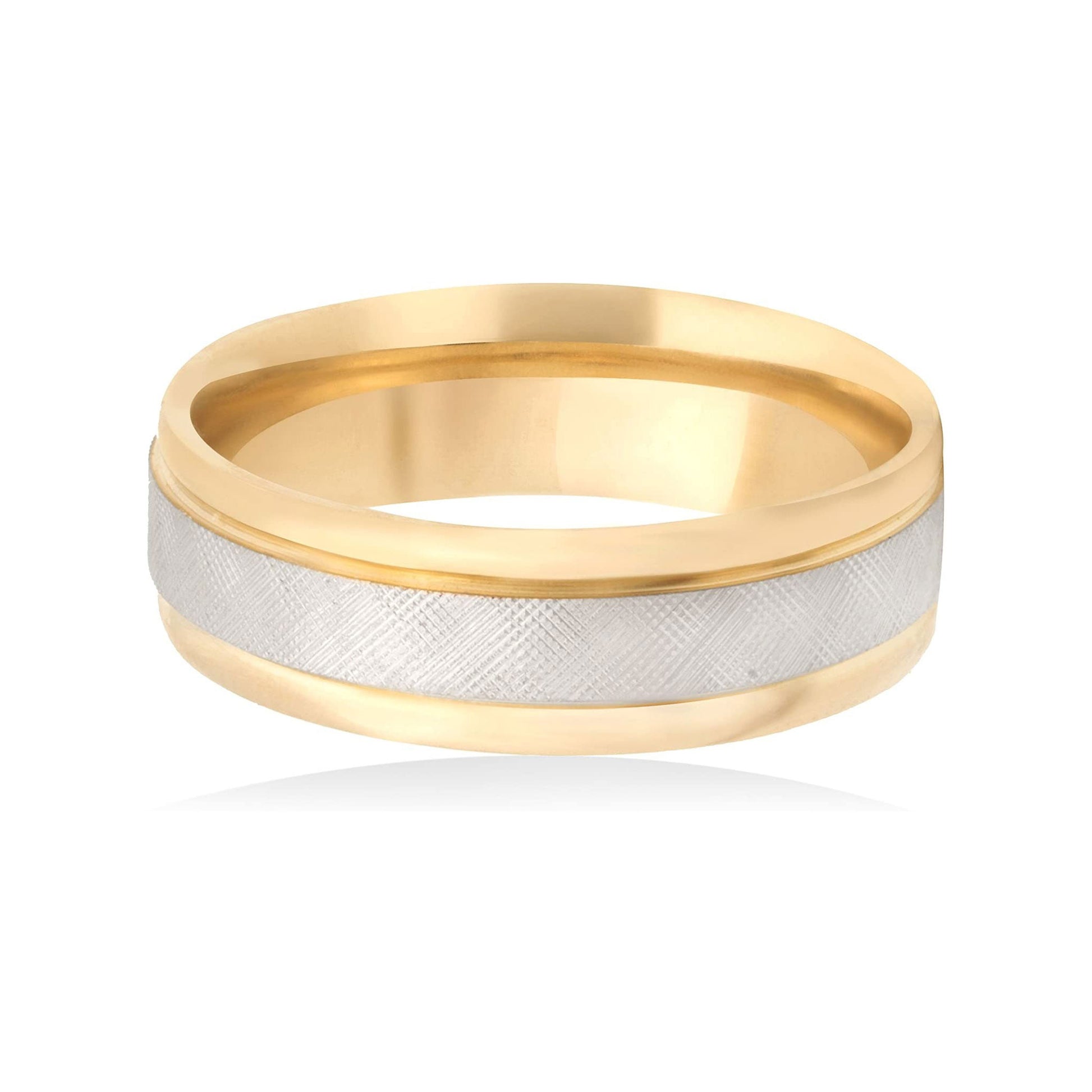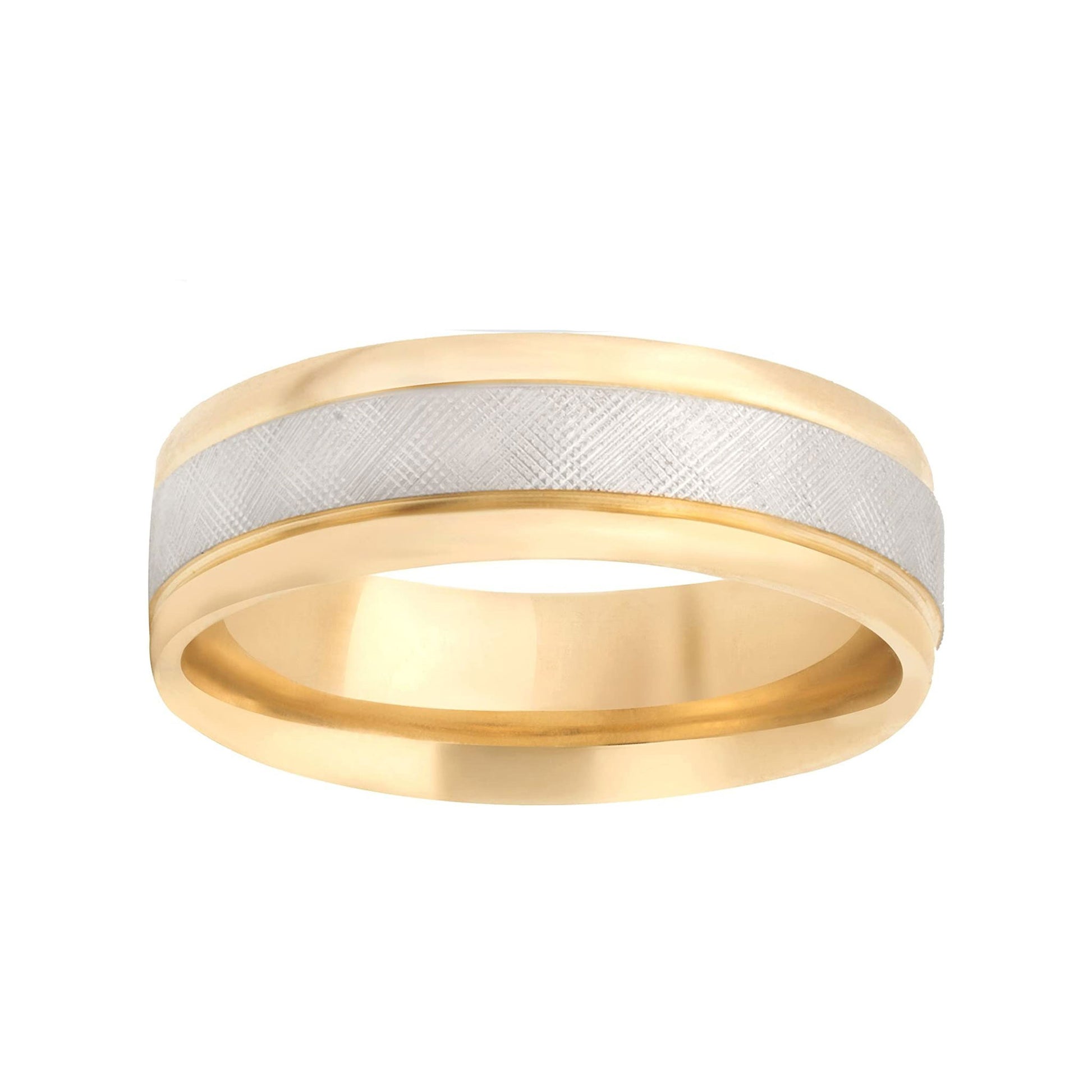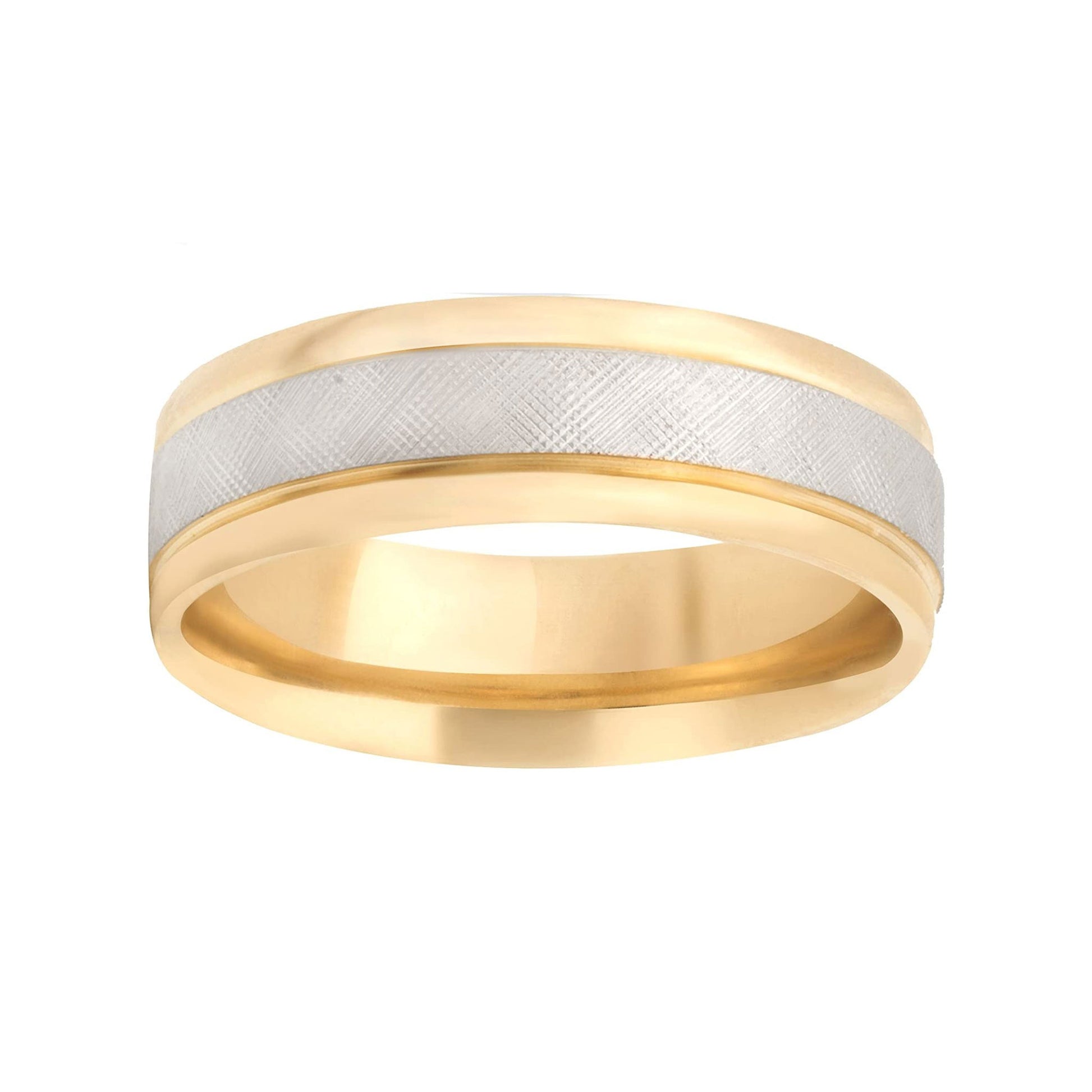 This incredible Two-Toned 6mm Gold Comfort-Fit High-Polished Wedding Band features 14 Karat White Gold Hatch Center Design with 14 Karat Yellow Gold along the edges that is both sleek and subtle. Most rings will get shipped within 2-3 business days.