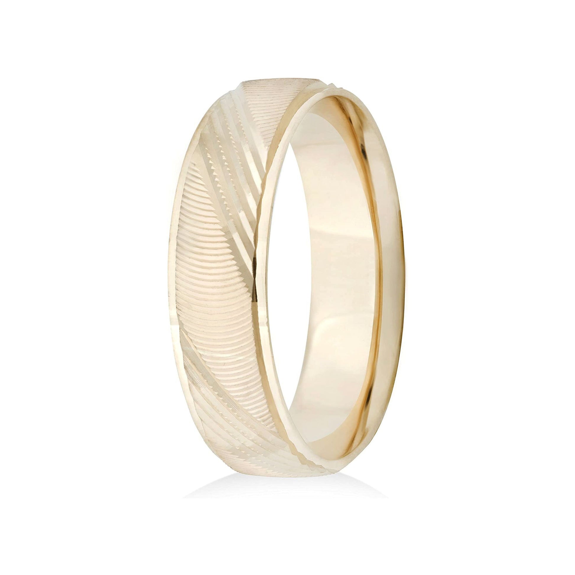 This incredible 14K Yellow Gold 6mm Design Wedding Band coupled with the strength and comfort of the comfort-fit design combine to make this band a great choice as a stand-alone wedding band or as a great addition to any engagement ring. The band, with its smooth design and polished finish, is a wonderful choice for the traditional bride and groom of today.
