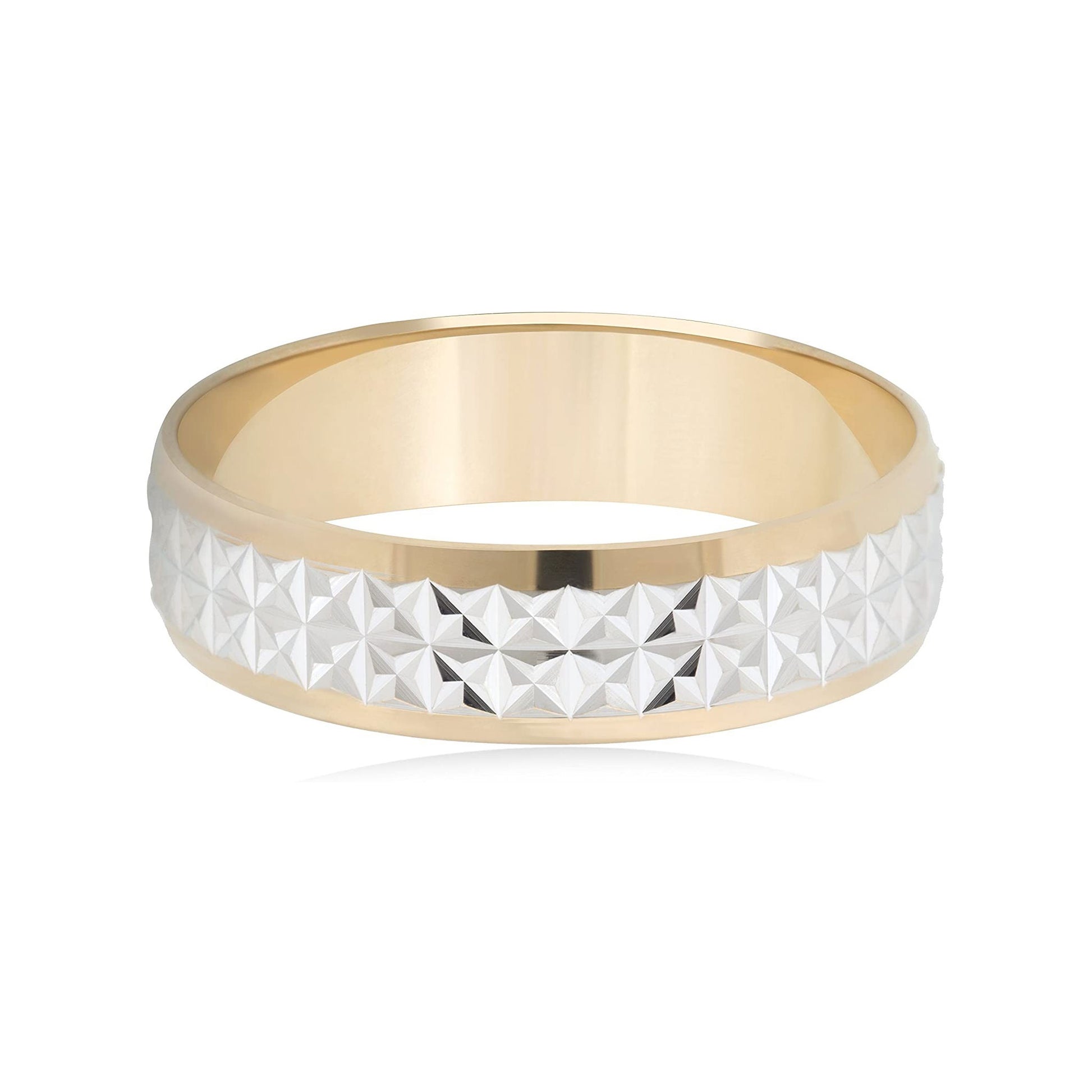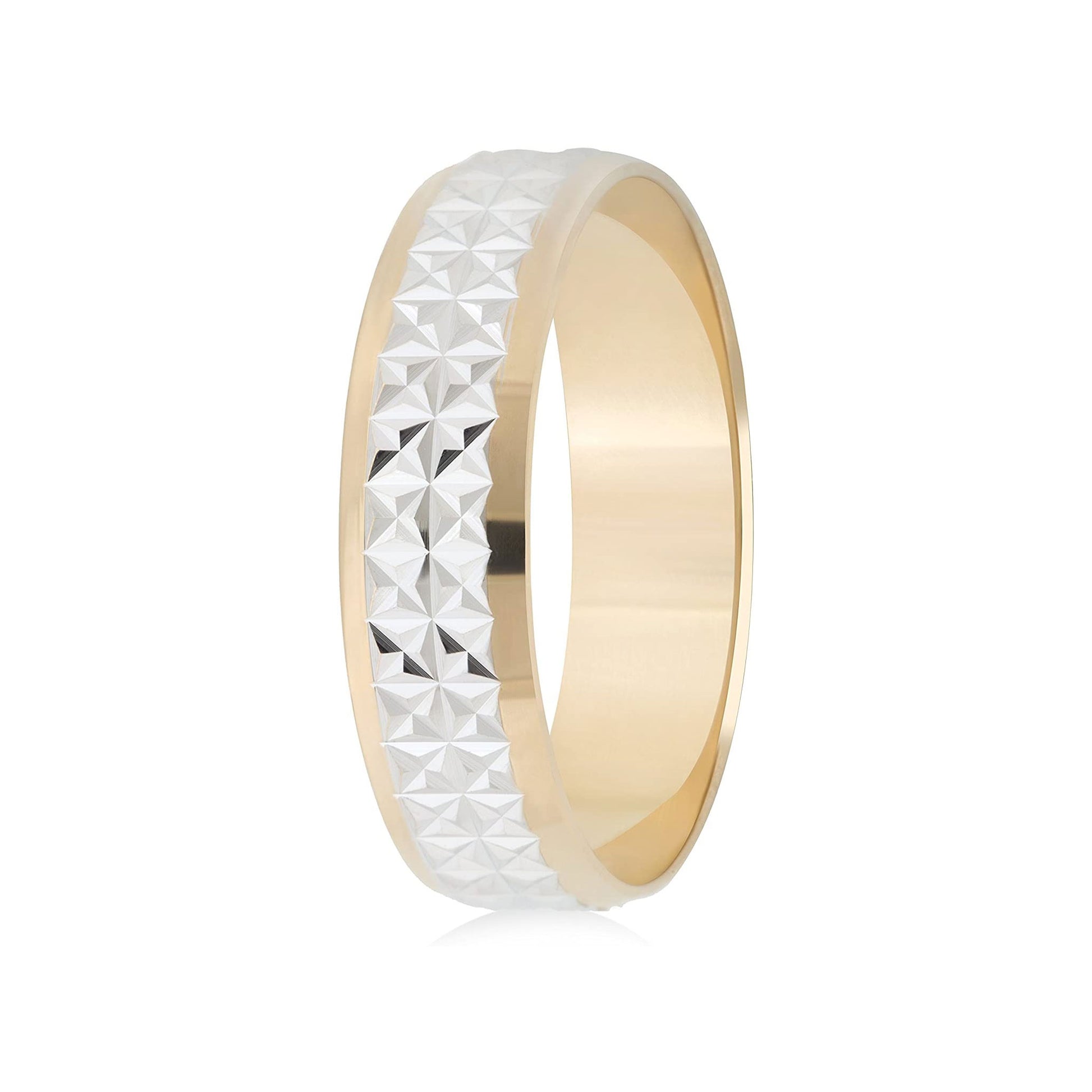 This incredible 14K Yellow/White Gold 6mm Design Wedding Band coupled with the strength and comfort of the comfort-fit design combine to make this band a great choice as a stand-alone wedding band or as a great addition to any engagement ring. The band, with it's smooth design and polished finish is a wonderful choice for the traditional bride and groom of today.